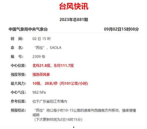 首先,得给你科普台风“苏拉”可是个货真价实的“风王”。它于2023年8月31日在西北太平洋洋面上生成,随后一路北上,给我国沿海地区带来了不小的麻烦。根据中国气象局的数据,台风“苏拉”的中心附近最大风力达到了17级以上,相当于每秒50米的风速,这可不是闹着玩的。